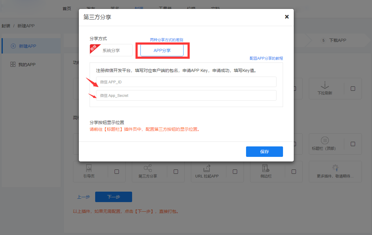2. 申请到Key后,请在【封装-我的APP】中,点击编辑,在选择插件页,打开【第三方分享】的插件,输入Key值。
